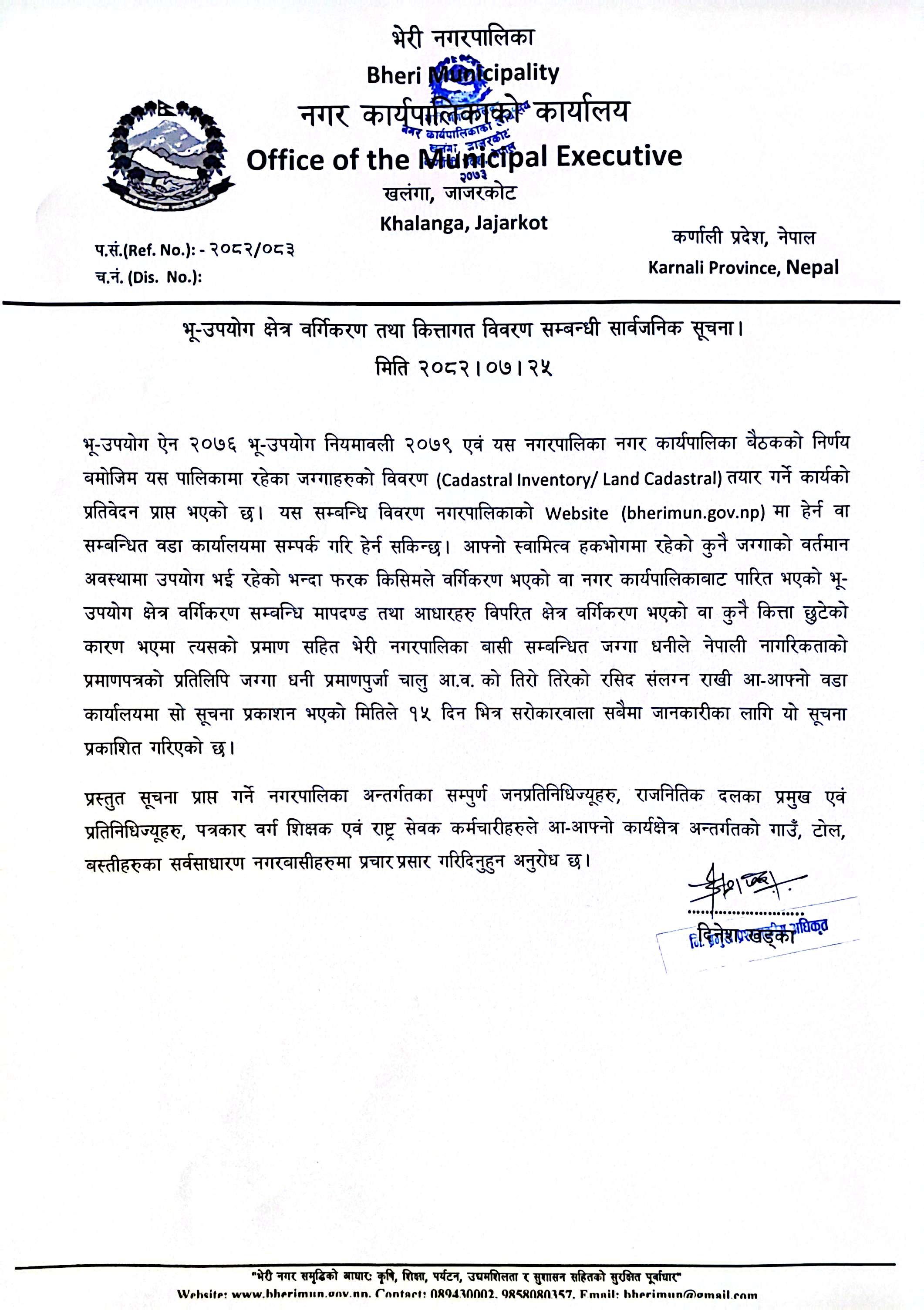 Home » भू-उपयोग क्षेत्र वर्गिकरण तथा कित्तागत विवरण सम्बन्धी सार्वजनिक सूचना। (विवरण सहित)