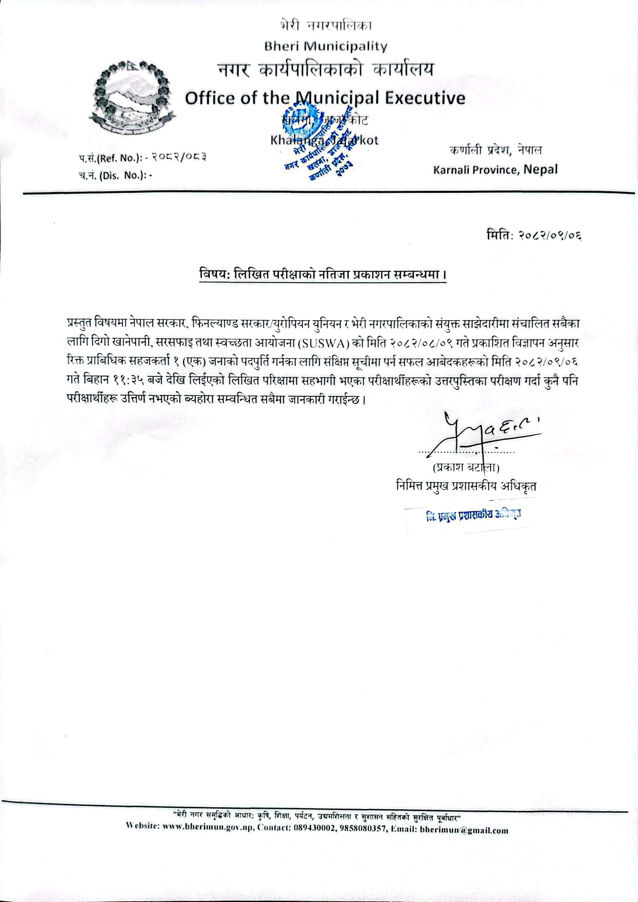 प्राविधिक सहजकर्ता पाँचौ (SUSWA) को अन्तिम नतिजा प्रकाशन सम्बन्धमा।
