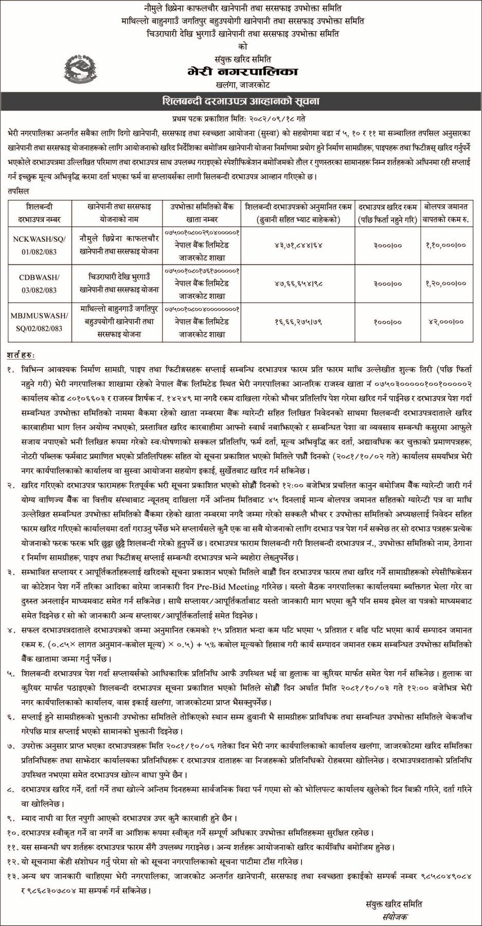 शिलबन्दी दरभाउपत्र आव्हानको सूचना ।